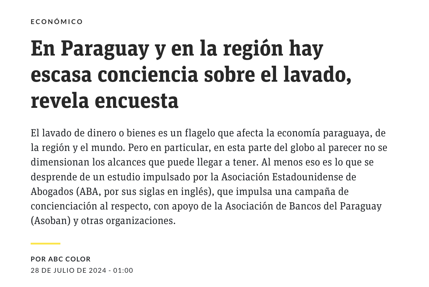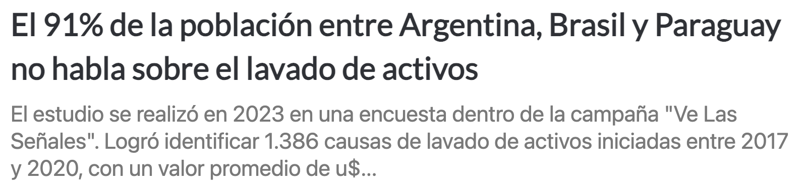El instituto ABA (American Bar Association), que lleva adelante la campaña “Ve las señales”, busca concienciar sobre los riesgos del lavado de activos y sus impactos en el desarrollo económico. En ese marco, realizó una encuesta el año pasado que arrojó como principal resultado que el 91 % de los encuestados en Argentina, Brasil y Paraguay, prácticamente desconoce los hechos ilícitos.
