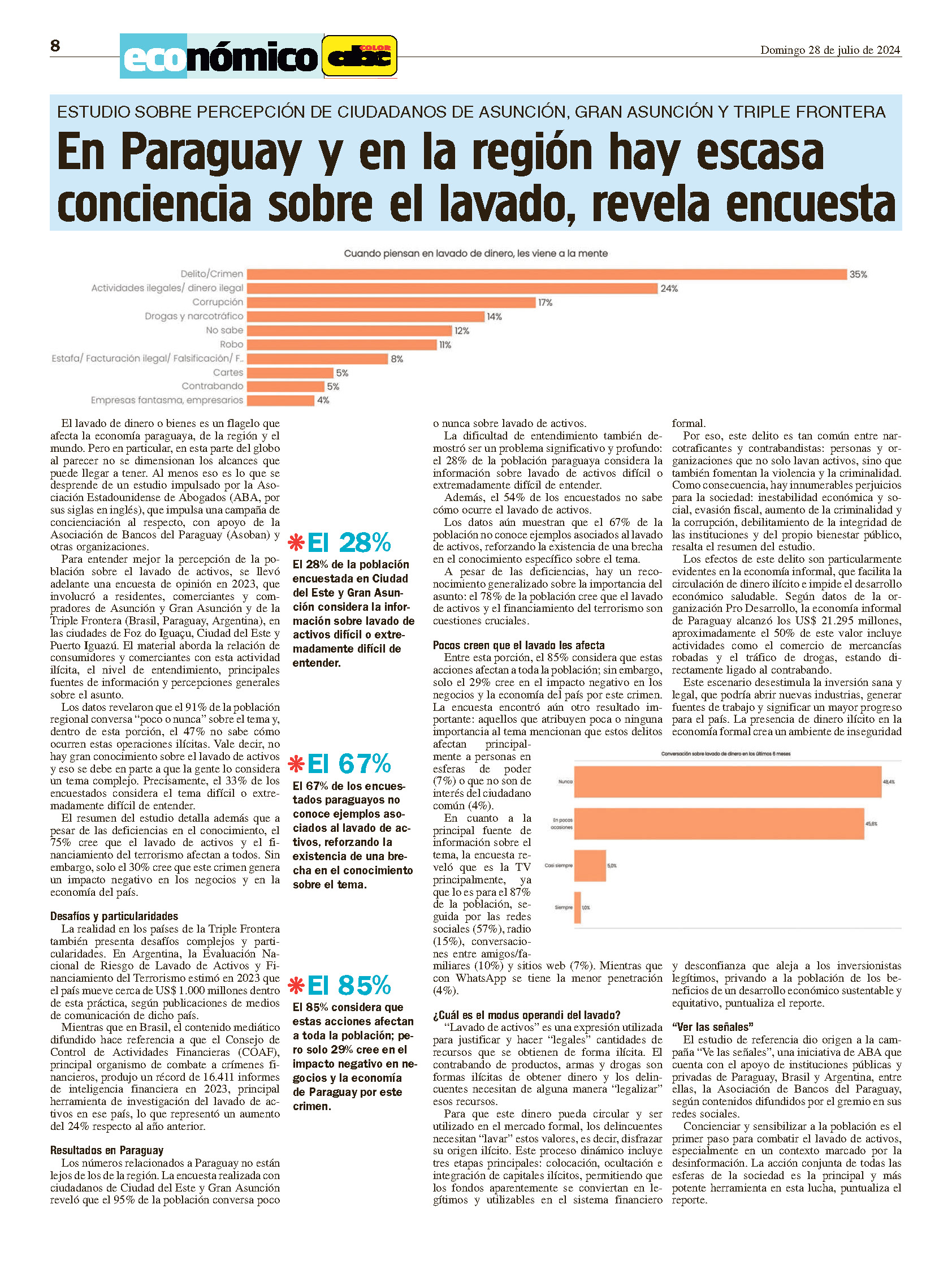 Una encuesta realizada en Ciudad del Este y Gran Asunción revela que el 28% de los paraguayos consideram difícil entender la información sobre lavado de dinero y el 54% no sae cómo ocurre, mientras una gran mayoría, el 78%, cree que es un asunto preocupante.